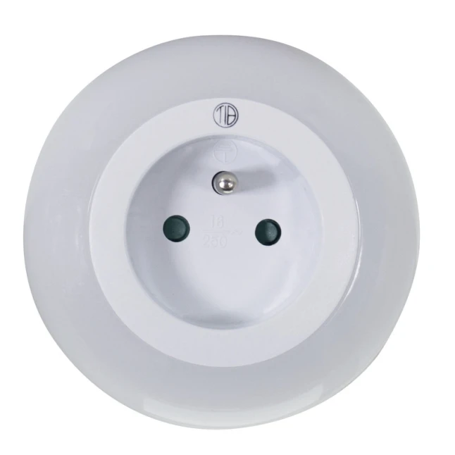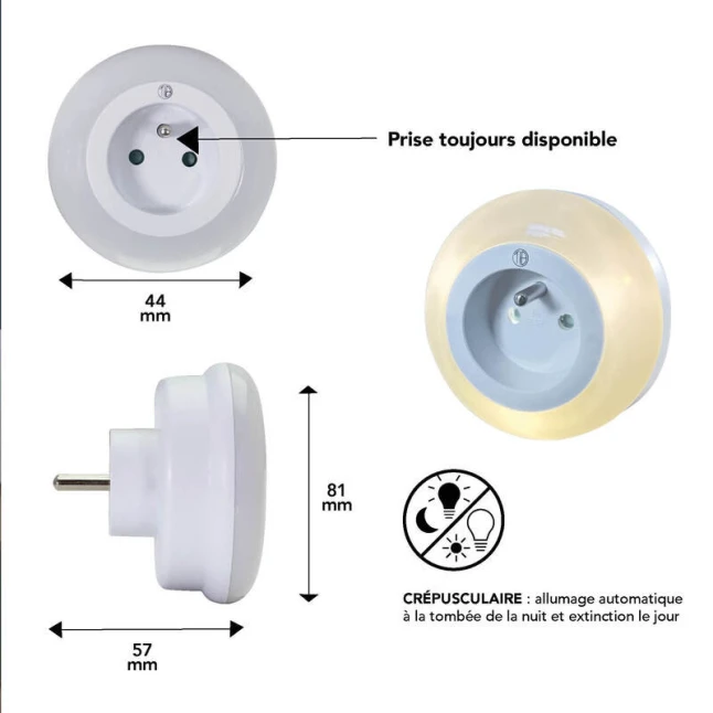 Le point souvent gênant avec une veilleuse à brancher, c’est la prise occupée. Ici, la prise frontale intégrée permet de continuer à alimenter un autre appareil sans multiplier les adaptateurs. Le branchement se fait sur une prise standard 2 pôles + terre, pratique dans la plupart des pièces. Son boîtier blanc compact reste discret sur le mur et s’intègre facilement à votre environnement.